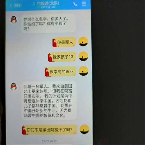 前两天有看到一个网友在分享许多美国人在中国玩的骗取中国女性朋友情感过程的“杀猪盘”,“杀猪盘”这个新鲜词我只看到柬埔寨的电信诈骗用过的词,怎么也不会想他道出了真实存在的事实,当时我就留言了一句:我最近也碰到一个阿富汗美国军人想找中国老婆的信息,没有想到有很网友留言只是笑笑……不会以为真有此事