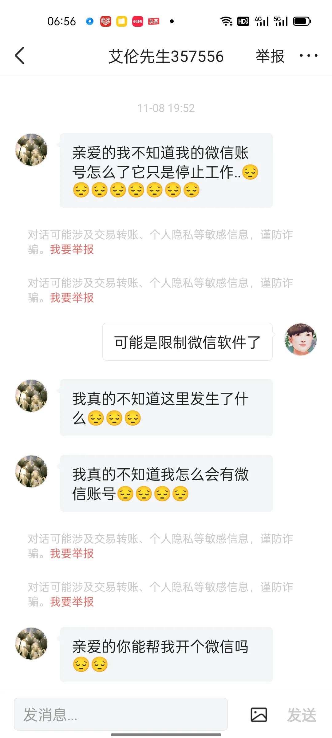而且凑巧的是遇到两个美国人,第一个遇到的是我入头条三天,一个名叫艾伦的告诉我他还向往中国,当时我只是单纯的想给他介绍中国的风土人情,而他给我说的是丧偶了,有一个三岁的女儿(当时分享了他和女儿的视频),在美国有自己的工厂……,大概聊了一周左右他说手机掉到水里了,刚去买的新的,要我重新加他的微信号,又过了几天他的微信又用不了,让我给他注册微信号?中国人都知道一个微信号就算手机坏了微信号都不会丢的,而他三番五次的更换微信号