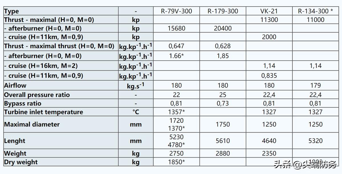 从R-79V-300发动机的技术参数上来看,R-79V-300发动机的涡轮前进气温度是1357摄氏度,和俄罗斯的AL31发动机相当,AL31发动机的涡轮前进气温度是1392摄氏度。可以看到R-79V-300发动机的技术水平其实和AL31发动机是同一代的。虽然R-79V-300发动机的推力比较大,但是这是用高达0.81的涵道比换来的。可以说R-79V-300发动机和AL31发动机都是第三代涡扇发动机。