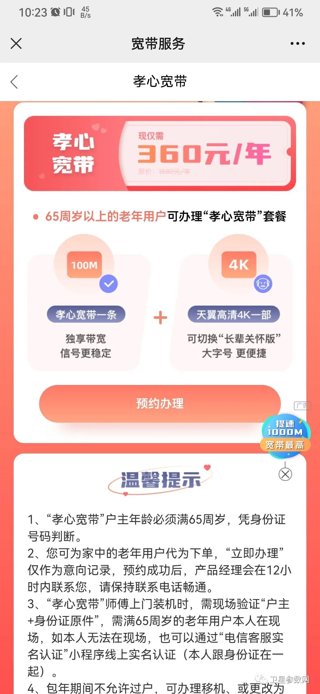 最新的孝心宽带也是一种非常优惠的选择,感觉是天天宽带的另一个变种,没有地域限制,它针对65岁以上的老年用户推出,每年只需支付360元,提供高速的网络连接,给老年人提供便捷的上网体验。这种宽带的推出,旨在让老年用户也能够享受到数字化生活带来的便利。