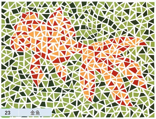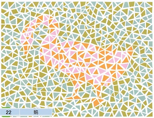 在第1幅图中,我们可以看到的是一只鹅。这个它是淡红色和淡黄色的规则图形组成,它的背景颜色是绿色为主,所以这幅图的难度并不是很大,除非是红色和黄色都色弱的小伙伴可能就无法识别了。