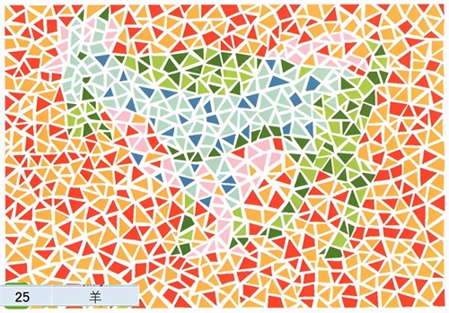 最后一幅图我们看到的是什么呢?答案给出的是一只羊。这只羊它是由绿色的不规则图形组成,由于背景颜色是红色和黄色的不规则图形组成,所以色差还是比较大的,基本情况下都可以识别出来这只羊,但是有些细心的小伙伴可能也会发现另外一种动物,那就是一只大公鸡。