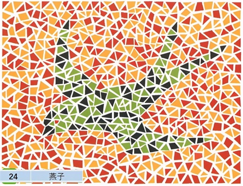 第3幅图它是一只燕子,这只燕子是绿色的不规则图形组成,同样也存着很大的色差。由于色差很大,所以就比较好识别了,嗯,这幅图的这只燕子是非常容易能够识别出来的。