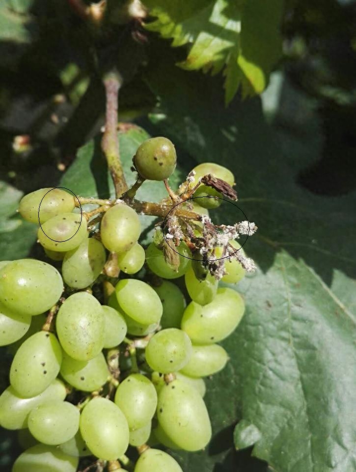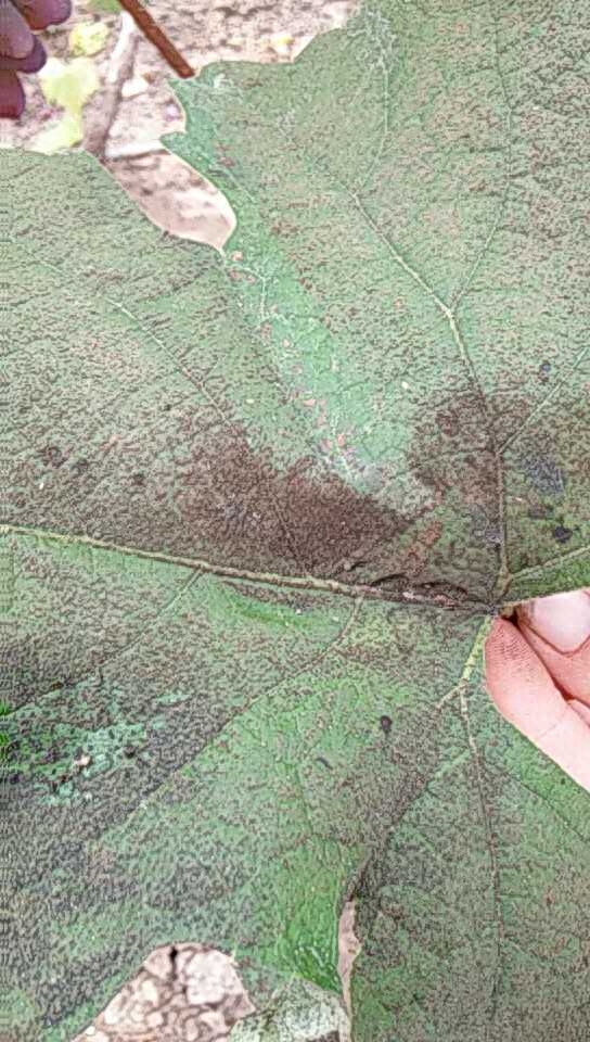 没老化好的中等枝条先感染。慢慢侵染叶片和果穗,叶片上有V字病斑,果穗腐烂。