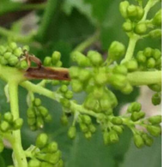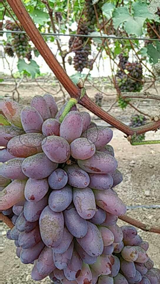下图是溃疡,总在不经意间到来,果粒没事,果梗干枯。上果之前一定先侵染枝条,这时候要注意观察枝条,抑霉唑,金霉唑,辛菌胺,咪鲜胺都有不错的效果