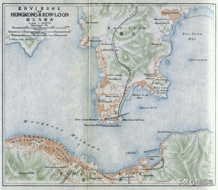 1915年:九广铁路於1910年通车,地图显示了路轨,另外还有黄埔船坞丶九龙寨城。