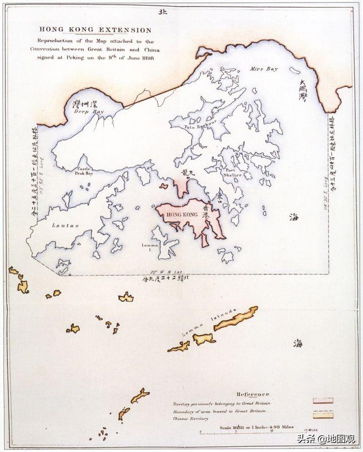 1898年:《中英展拓香港界址专条》附图,之後新界租借予英国。