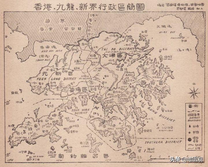 1961年:香港行政区图,留意当时香港没有分区丶九龙分为九龙和新九龙丶荃湾元朗大埔均是大区。