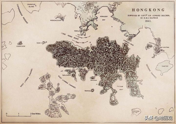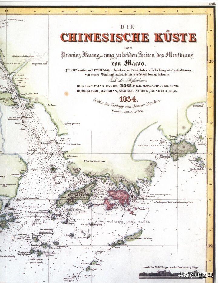 1834年:德国人绘制的广东省沿岸海图,在鸦片战争之前,Hong Kong(香港)丶Co Lun(九龙),Lamma(南丫岛)丶Lantau(大屿山)等地名已出现。