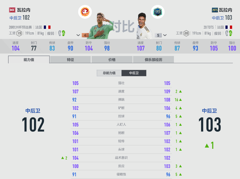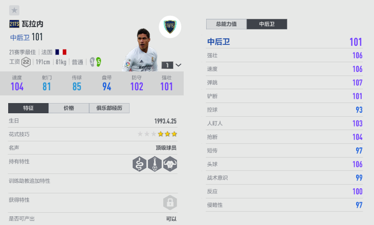 21TS作为瓦拉内的巅峰卡,强度最高、工资最高、价格最高,在新版本里有希望成为仅次于范迪克的第二回追中卫。未来转会户口更新后,他将成为红魔玩家的又一个强力武器,优先级甚至会高于价格偏贵的费迪南德。推荐资金充足、追求顶配阵容的玩家入手高强。
