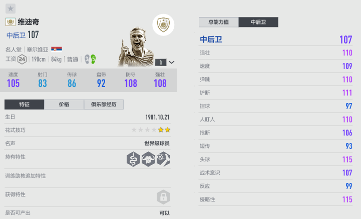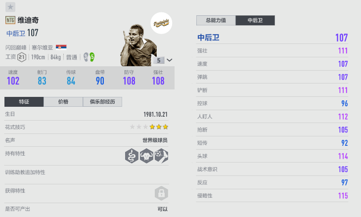 不过ICON赛季的价格偏贵,平民玩家可以使用这张NTG赛季。和ICON相比,NTG5卡也有着不错的正面防守能力,抢断拦截和对抗没问题。不足之处在于NTG的转身要慢一些,且手感略硬,容错率和稳定性不如ICON那么高。总的来说,想用维迪奇的玩家,还是优先推荐ICON赛季;如果资金有限,那么使用性价比高的NTG赛季也没问题。