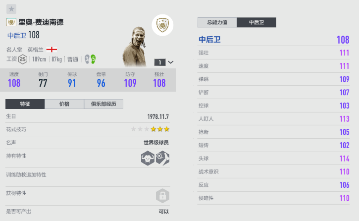 玩家们都知道这个版本后卫会面临较大的直塞威胁,因此速度、灵活等属性就尤为关键,这是一名中卫能够及时转身回追的决定因素。ICON费迪南德初始速度就高达111,加速也有106,在启动方面非常迅捷;同时ICON费迪南德灵活比较好、转身及时,没有太大的僵直感,能比较流畅自然地完成转身启动过程。这些优点让费迪南德在回追时有更大把握,增加了他对于速度型前锋的防守质量,能够减少被直塞打穿的次数。