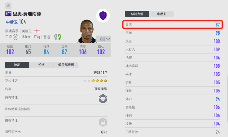 和ICON赛季相比,HOT费迪南德价格更便宜,但短板也更加明显。如上图所示,HOT费迪南德6卡初始灵活只有87,使得他在转身方面存在短板,回追能力比起ICON差距较大。因此对于平民玩家而言,可以先使用HOT赛季过渡,将ICON费迪南德作为长期目标来积攒资金。