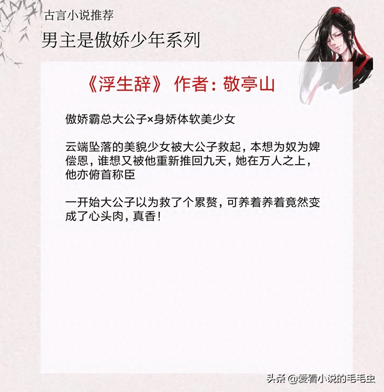 大家好,我是毛毛虫,今天推荐5本男主是傲娇少年的古言,他口嫌体直爱吃醋,默默将女主宠上天