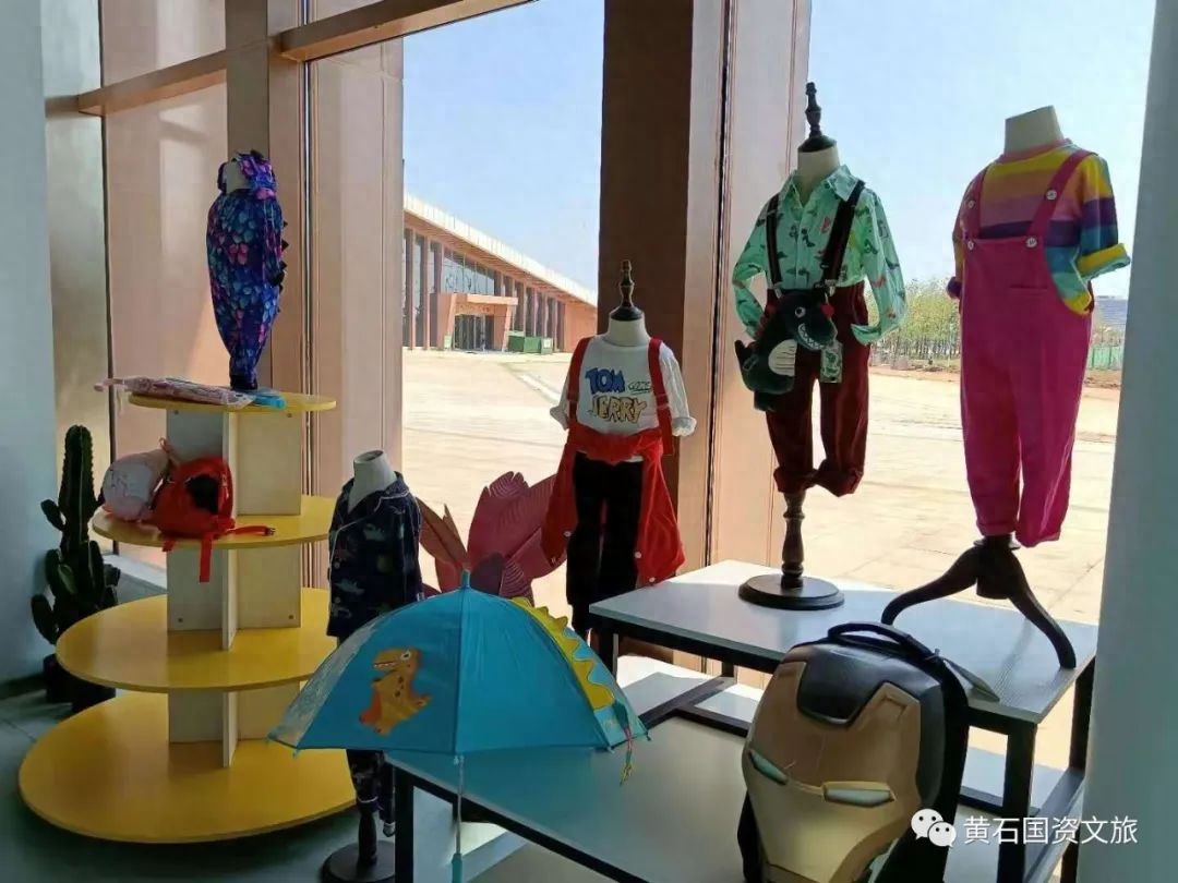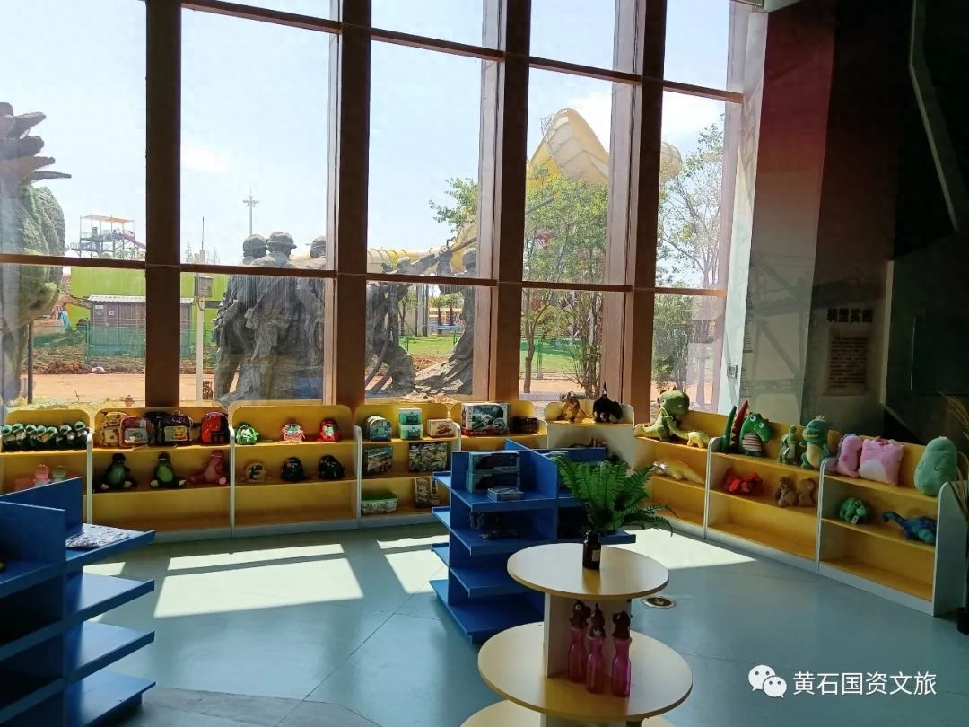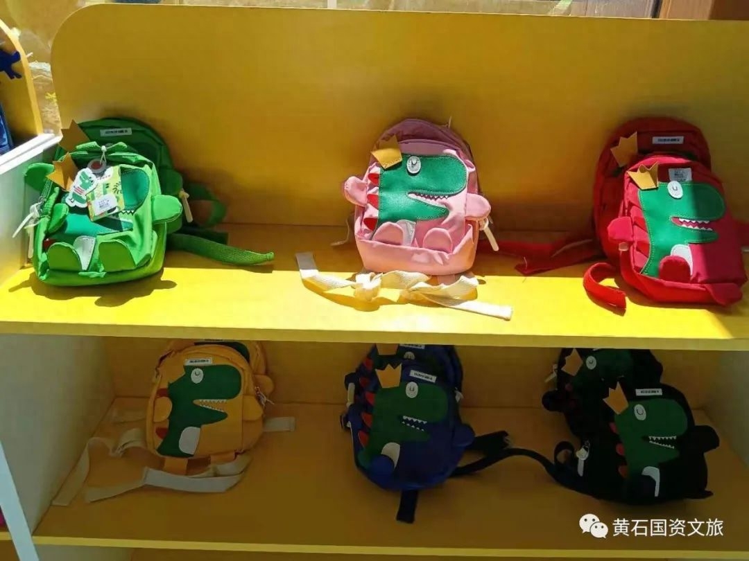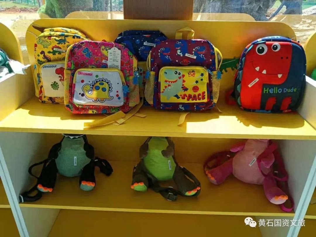记者在园区内的主场馆看到,门口左侧一角摆满了琳琅满目的恐龙化石积木、恐龙蛋、恐龙衬衫以及立体儿童伞卡通文具盒等与恐龙有关的玩具和小装饰。