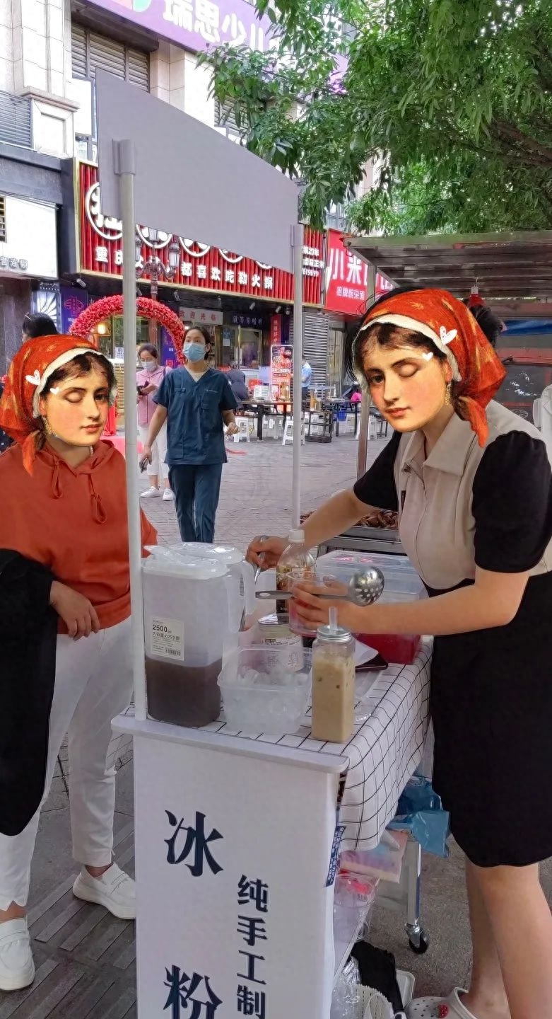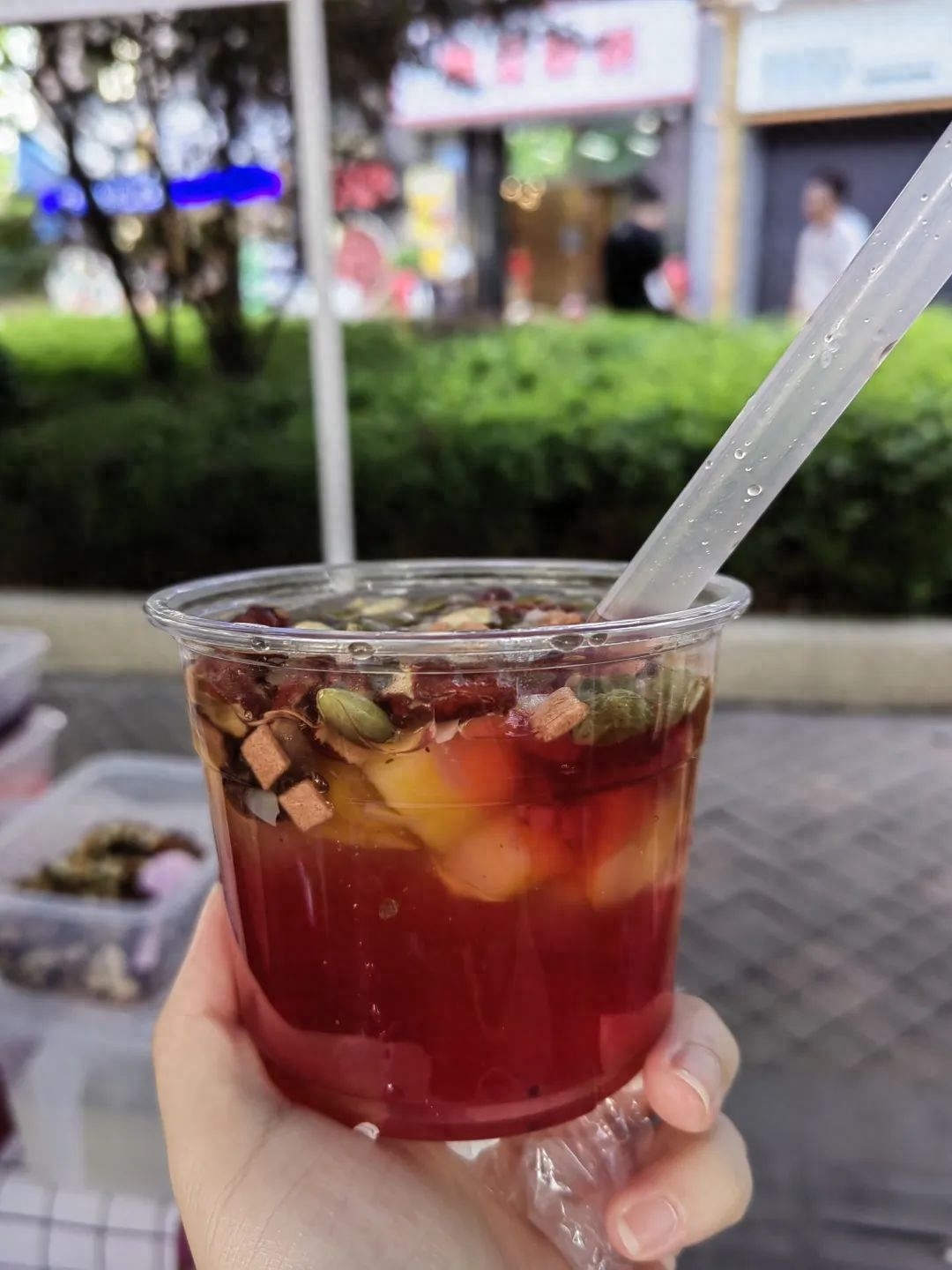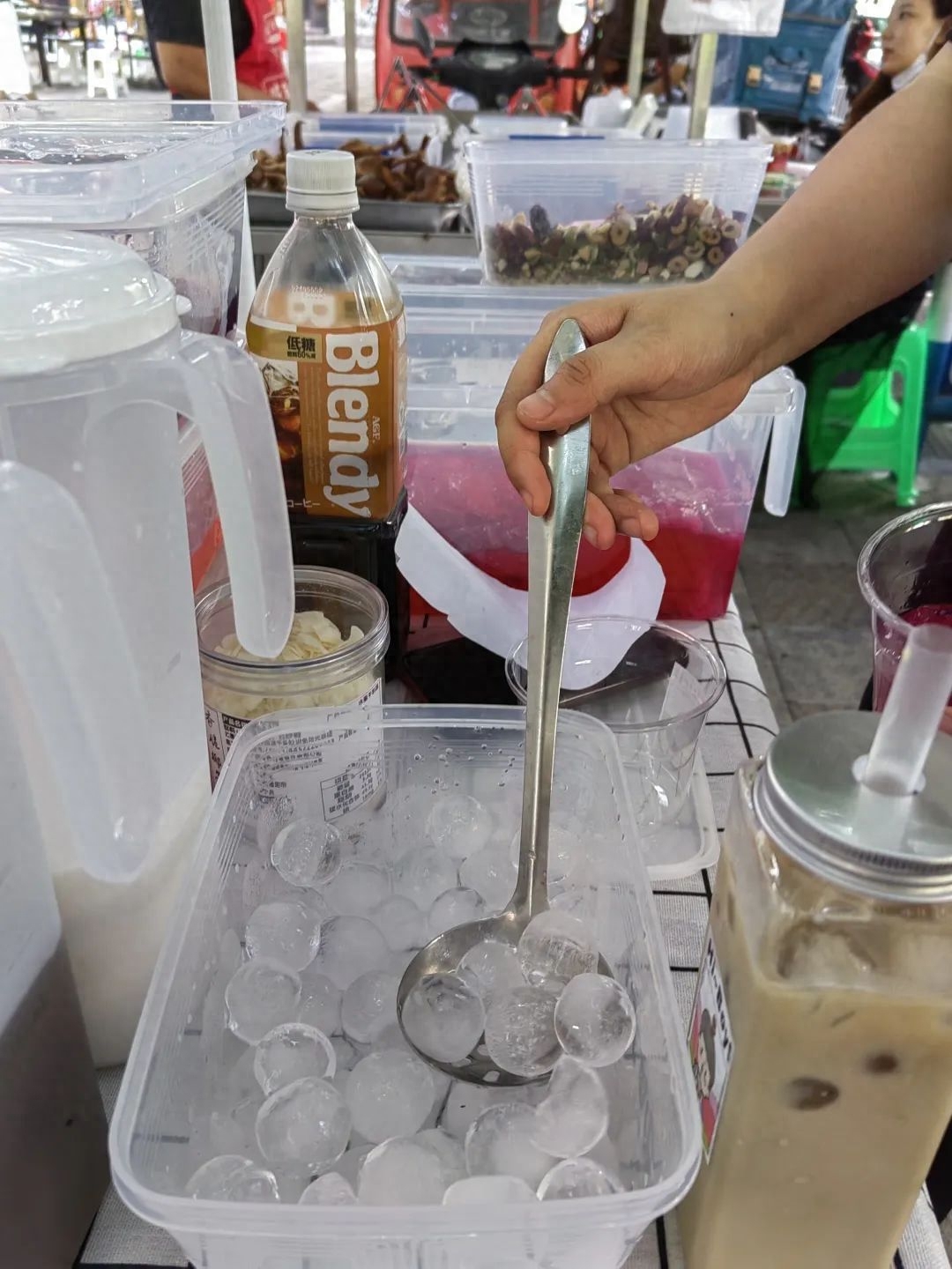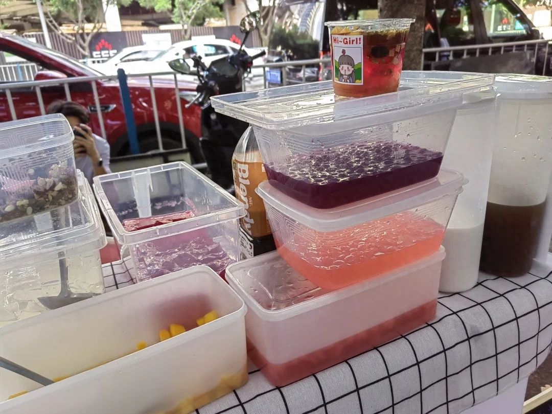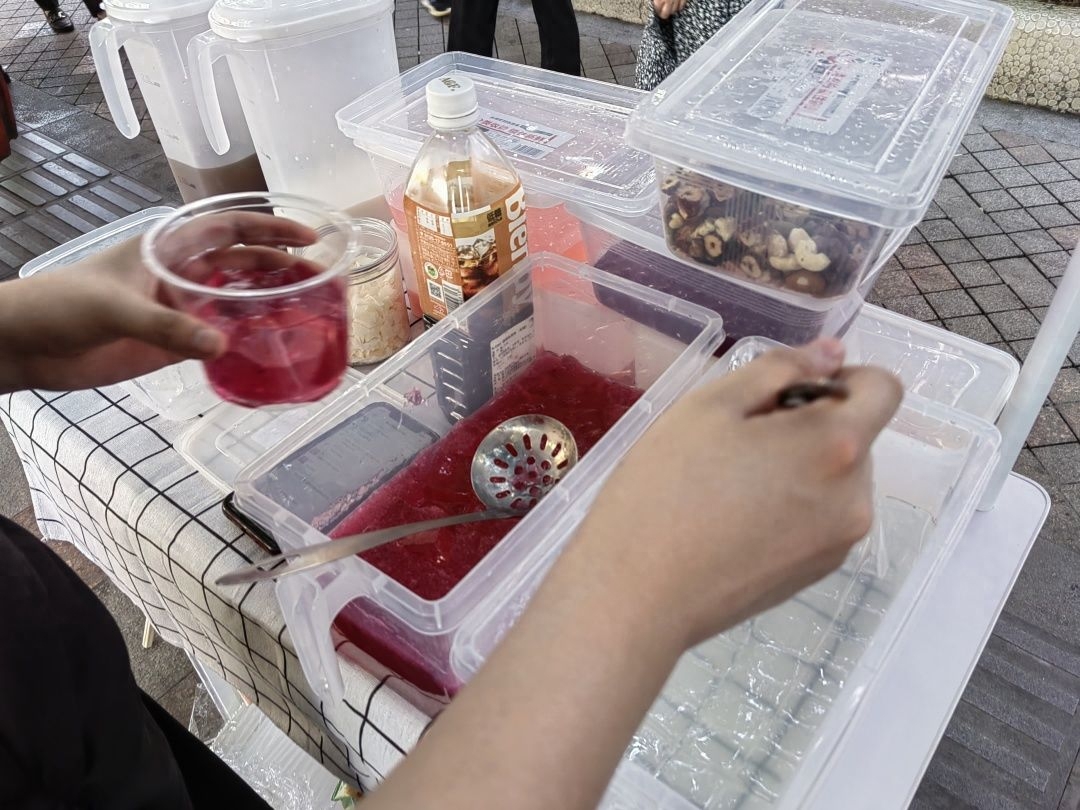 小姐姐作为一个热情大方的年轻人,待人接物真的没话说。东西摆好了就做了几碗冰粉给旁边的商贩送去,得到了一致好评。