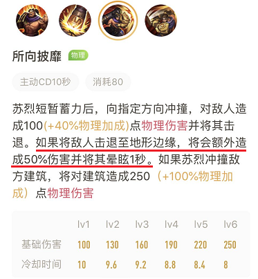 苏烈的2技能作为一个击退+位移的技能,虽然存在着速度慢控制效果不连贯等缺点,但在2技能的技能描述中,存在着“碰撞墙体触发晕眩”的这么一个词条。