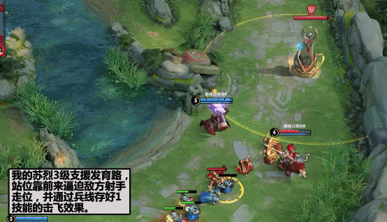 这就使得苏烈在GANK中有一个不容易被敌方反应的先手控制,从而衔接13技能完成控制链;而其中的前提条件就是“碰撞墙体”。