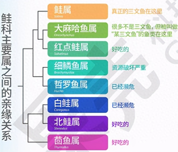 鲑科鲑亚科主要有鳟/鲑属(大西洋鲑)、太平洋鲑(大马哈鱼)属等。 鳟/鲑属(大西洋鲑)也就是正宗的三文鱼,主要吃肉(生鱼片),肉里没小刺,还有鱼籽酱(红色)。大粒不贵,目前已经人工养殖了,人造咸水养殖,驯化淡水养殖也有,冷水鱼不好养,设施超级贵,水质要求极高。