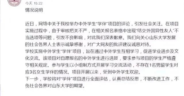 在舆论压力下,山东大学终于在7月12日下午通过官方微博发表了一份道歉声明,承认了自己在陪学制度实施过程中的失误和不足,并表示将对陪学制度进行全面评估。这份声明称,在项目实施过程中,由于审核把关不严,在相关报名表格中出现“结交外国异性友人”不当选项等问题,引发不良影响,对此山东大学深表歉意。向关心山东大学发展的社会各界人士表示诚挚感谢,对广大网友的批评建议诚恳对待。山东大学强调,学校实施中外学生“陪学”项目,旨在通过中外学生互相学习,促进学业进步及文化交流。该项目对自愿报名的中外学生进行选拔,要求参与项目的学生严格遵守相关规定。参与学生以小组制方式开展学习交流活动,不存在一个男留学生对应三个女中国学生的情况。山东大学表示,下一步,学校将对“陪学”项目进行全面评估,认真总结反思,不断改进工作,不负社会各界对山东大学的期望。