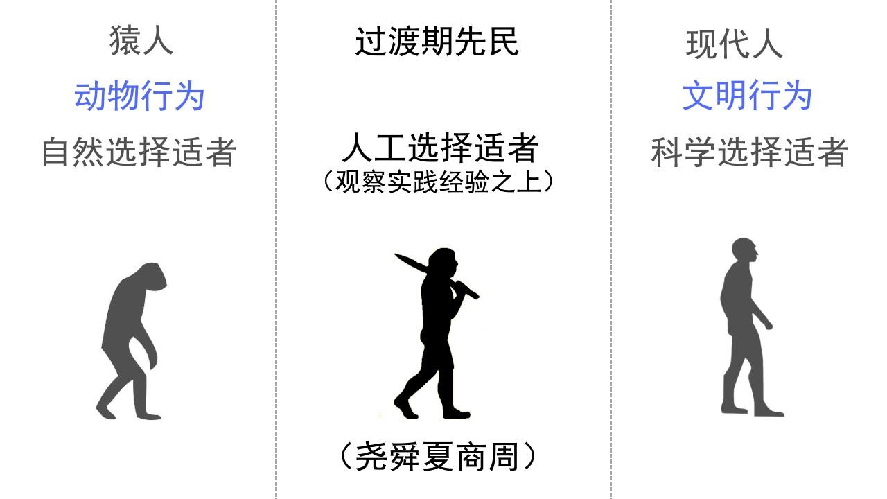 小结:在尧舜夏商周时期,先民通过人工选择最适者,并以礼、习俗、文化、知识的方式传承下去,最终实现了人类由动物行为演化成文明行为。而选择能够给人类带来更多福利的最适者,贯穿于从晚期智人到文明人进化的全部进程,成为这一时期人类进化的主轴。