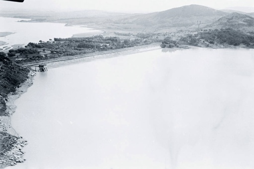 直升机继而转向铁路以西,视察被冲垮的板桥、石漫滩水库。两座水库的大坝都在中段被冲开,形成深深的豁口。库水早已排完,露出干涸的库底。坝下沿河两岸,无论是村庄房屋还是道路树木,都被洗劫一空,留下一片荒凉。