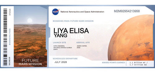作为普通人,有生之年可能都无缘登上火星。不过,NASA近年来举办的“火星船票”活动,却能从一定程度上弥补我们的遗憾。在每张船票上,都有独一无二的姓名和编码,以及飞行的总里程数——5500万公里,即地球和火星之间的最近距离。