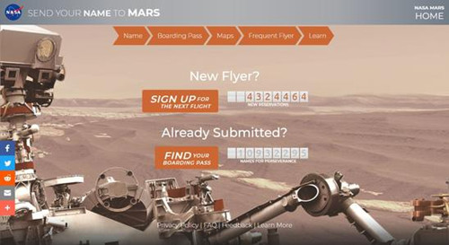 几年前的NASA又火了,截止目前NASA官网显示已经有12277511登机了前往火星的船票。将自己的名字登陆后,在2026年会被刻在芯片上,一起飞向火星,虽然本人不能去,但是名字去了就很浪漫了。