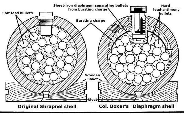 开花弹的原理要高级很多,开花弹引线做了改进,不用先点燃,开花弹是在炮膛内利用炮膛的爆炸产生的火点燃炮弹,最后炮弹被爆炸了推出去,开花弹的爆炸是可以控制的,能算好的。