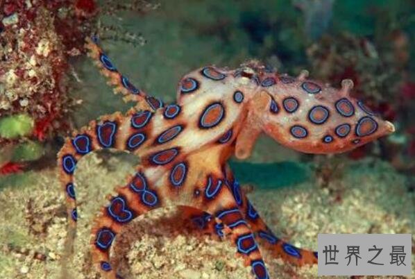 这种章鱼还被叫做蓝圈章鱼,是海洋中的剧毒生物之一,如果遇到了捕食者会让身上和爪上深色的环发出耀眼的蓝色光芒,这种小章鱼经常祸害潜水者,被咬上一口不及时就医的话会造成人类的死亡。