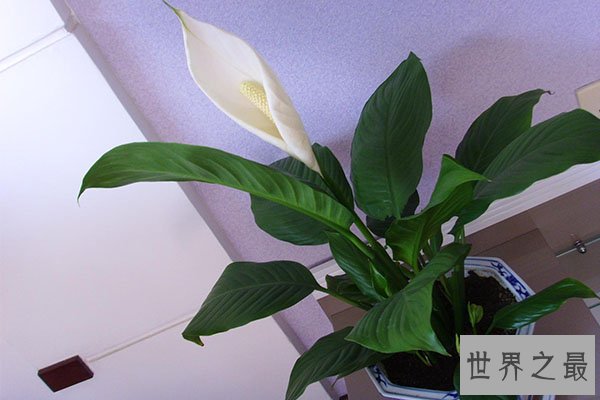 白鹤芋也是十种旺财旺宅植物之一,原产于美洲热带地区,后在各地广泛栽培,开花时的十分美丽,对室内的氨气、丙酮、苯和甲醛都有清洁作用。
