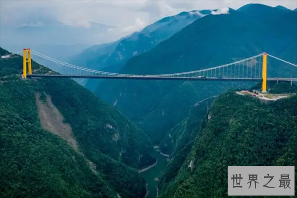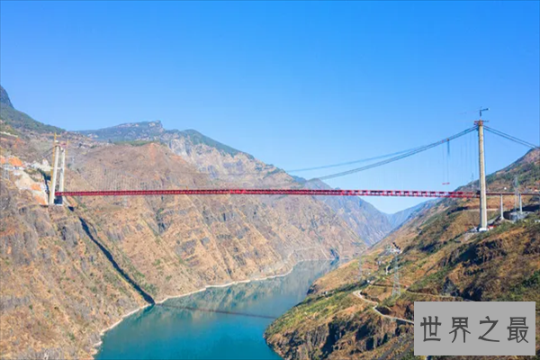 金沙江特大桥位于丽江和香格里拉虎跳峡景区的交界处,两端于隧道相连接,是一座钢桁梁悬索桥,全长882.5米,桥高512米左右,在2020年正式完成建设。