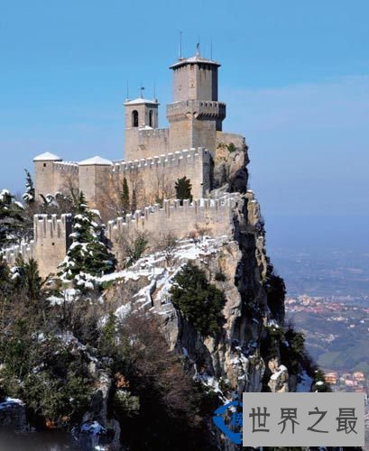 圣马力诺是国中之国,位于意大利亚得里亚海滨城市里米尼附近的蒂塔诺山上。这里不见边防关卡,只见山脚下有一个大门式的装饰,上有一横幅书写着:古老的共和国欢迎您。这就是圣马力诺国界的标记。