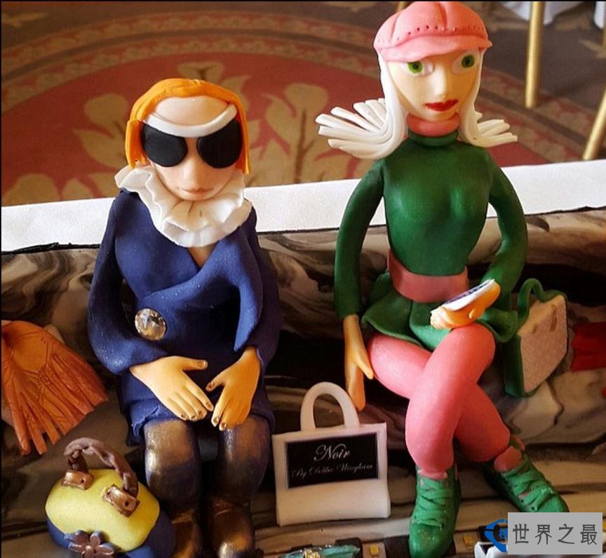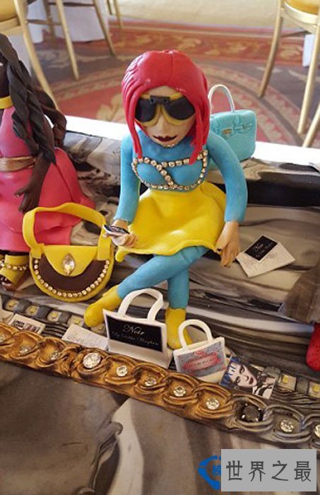 这个蛋糕将被用在这位富有客户女儿的生日派对和订婚派对上。它有近2米长,整体造型为时装表演台,配有温纳姆设计的时尚服装。蛋糕上还有几个穿着长袍的小人像。这些小人像挎着品牌手袋、穿着品牌鞋子、戴着遮阳镜,有的还举着手机和平板电脑。整个蛋糕用了温纳姆1100多个小时完成,每块都是她亲手雕刻。