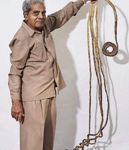 其实在李·雷德蒙德之前,印度普纳市的什里达尔·奇拉尔才是吉尼斯认可的世界上指甲最长的人。如上图所示,这个男人只留左手的长指甲,其5个指甲总长度为20英尺2.25英寸(约6.15 米)。