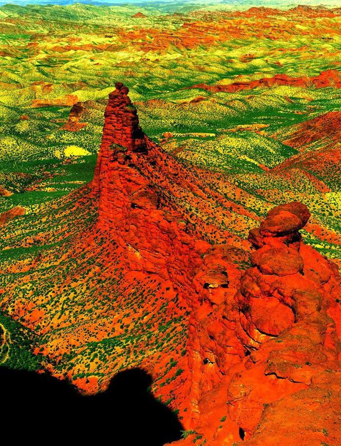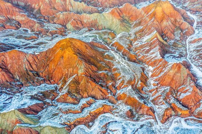 它绵延百里,一片褐红,如一座熊熊燃烧的火焰山,配上皑皑白雪,壮丽而又炫目。