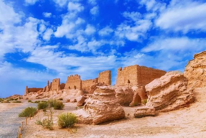 一座座土黄色的古城堡耸立在青灰色的戈壁之上,衬以蓝天白云,显得分外妖娆。