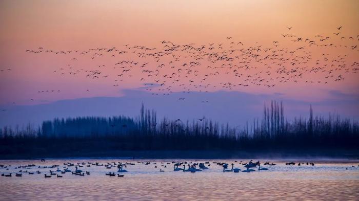 一入秋,金塔胡杨林由金黄色变成金红,最后化为一片褐红,渐渐地融入朦胧的夜色之中。