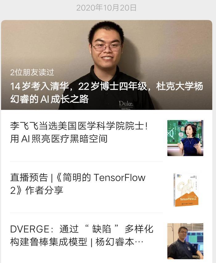 一提到北京八中少年班我就都明白了,这不是巧了嘛,AI科技评论在2020年10月份曾写过一篇AI人物文章中的杨欢睿同学也是毕业于北京八中少年班,也是14岁考入清华大学。