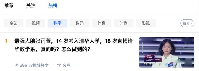 然后看到了这样一个话题:《XXXX张雨萱,14 岁考入清华大学,18 岁直博清华数学系,真的吗?怎么做到的?》,该话题热度排在科学榜第一,说实话这么高的热度我是有些不太理解,这难道是很罕见的事情吗?