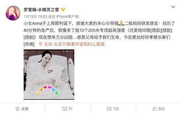 奥运冠军罗雪娟发文宣布二胎产女喜讯,“小女Anna于上周顺利诞下,感谢大家的关心与祝福。图中女神把宝贝抱在怀里,宝宝还闭着眼睛,而妈妈微笑着充满幸福感。罗雪娟写道:“小女Anna于上周顺利诞下,感谢大家的关心与祝福,二胎妈妈获奖感言:经历了80分钟的急产后,就像来了组10个200米专项超高强度(还是短间隙)现在想来万分凶险…感恩父母给予我们生命,今后更加好好孝顺长辈们 ”网友纷纷留言:“祝福水精灵喜获千金,家有儿女”、“罗罗凑了个好字”、“恭喜娟姐,祝宝宝健康成长!家庭幸福!”