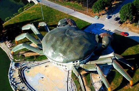 这个建筑的造型就是一只高度还原的"生气的"圆滚滚的河豚,通体金色仿佛在空气中游走。据说打造它花费了整整7000万,这样巨大的投资建成的建筑实用性却非常的差,观赏性也几乎没有。所以很是令人匪夷所思。第五个建筑:有点恐怖的大闸蟹建筑