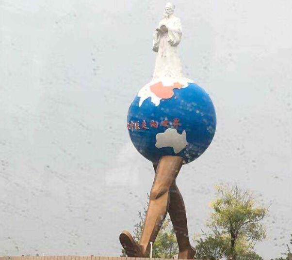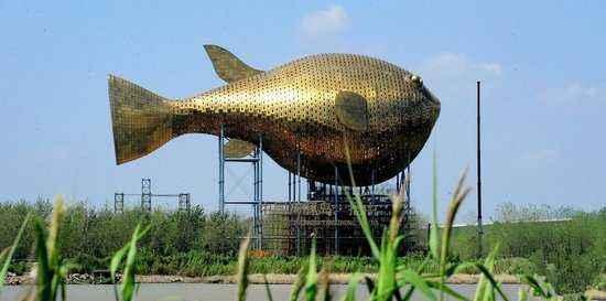 这个雕塑小编没有查到它具体在哪里,但是它的雕塑却真的是大大的写实。因为整个雕像可以说是点题符合名字的超级典范。中医,走向,世界这三个词分别用极具代表性的元素表示出来之后,做了简单的上下结构的拼合。于是就出现了,洞穿地球的两条大粗腿行走装的雕像。设计出来这个雕像的人可能自己都没法理解为什么甲方会允许这种东西制作出来,丝毫没有中医的专业和中国特色。第四个建筑:江苏极端写实主义建筑河豚塔