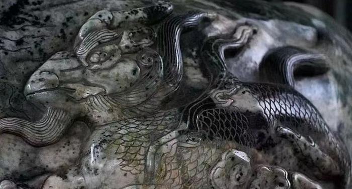 若细观大玉海上的雕刻,就会发现上面雕刻的像极了一幅“龙宫世界”图。大玉海周身雕刻翻滚的浪涛,海浪之中有十几种动物图案,龙、螭、羊、鲤鱼、犀、螺、蟾、蚌、鳌鱼、马、豚、鼠头鱼等等,形神兼备,神秘莫测。
