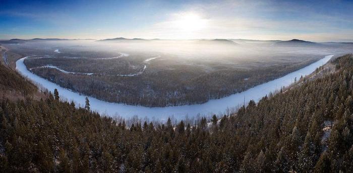 黑龙江省森林覆盖率提高到43.6%,图为大兴安岭地区漠河县图强镇九曲十八湾冬季全景。