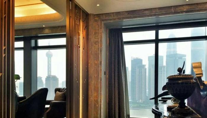 最贵总统套房面积达到288㎡,有超大会客厅、吧台、书房、餐厅、备餐间、衣帽间、客用梳妆室等等,卧室里能看到上海浦东全景。