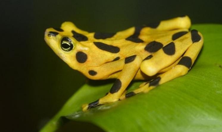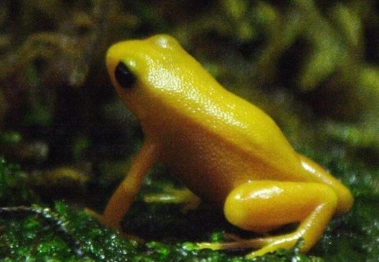 这种青蛙是巴拿马雨林特有的青蛙,外观特别漂亮,金色的身体带着黑色的斑纹,一般在夏季出现皮肤十分光滑。这种青蛙是有剧毒的。