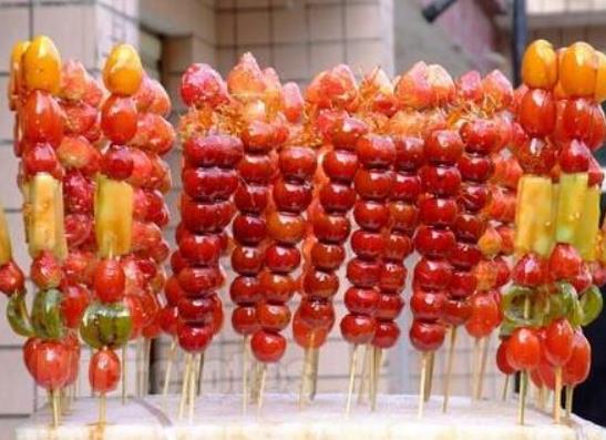糖葫芦是我国传统小吃,有几百年的历史,是用山楂和冰糖做成。开始的时候糖葫芦只有山楂的,现在慢慢的发展,有各种水果味道三天可口非常好吃。