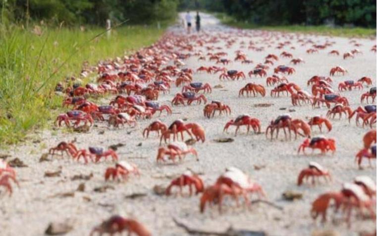 在澳大利亚的一个岛屿上,每年都会有1.2亿只的圣诞地蟹迁徙,他们会爬到海边产卵,等小螃蟹长大之后再迁徙到中部的雨林里面。