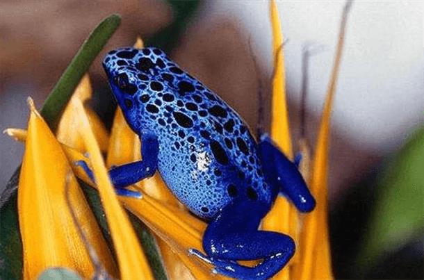 蓝色箭毒蛙通体是明亮的,宝蓝色看上去十分艳丽,但漂亮的外表下却隐藏着巨大的毒性,是世界上最有名的毒青蛙。